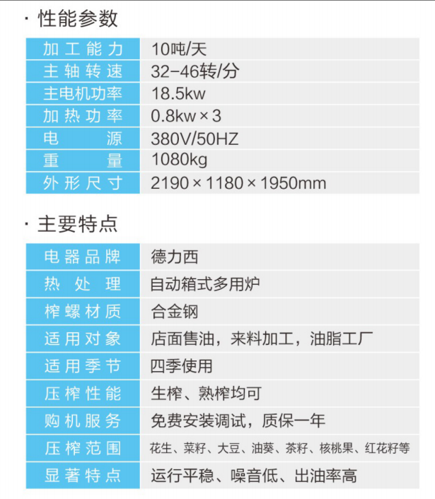 ★壓榨范圍:花生、大豆、菜籽、油葵、茶籽、芝麻等;★適用對象:店面油坊和微小油坊;★壓榨性能:熱榨一次榨盡,免費(fèi)安裝調(diào)試