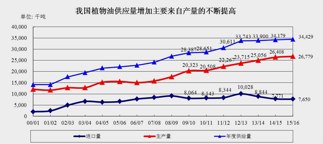 2015年度,我國食用油市場的總供給量為3442.9萬噸,其中包括國產油料和進口油料合計生產的食用油為2677.9萬噸,仍有合計為765萬噸食用油缺口需要依賴進口!